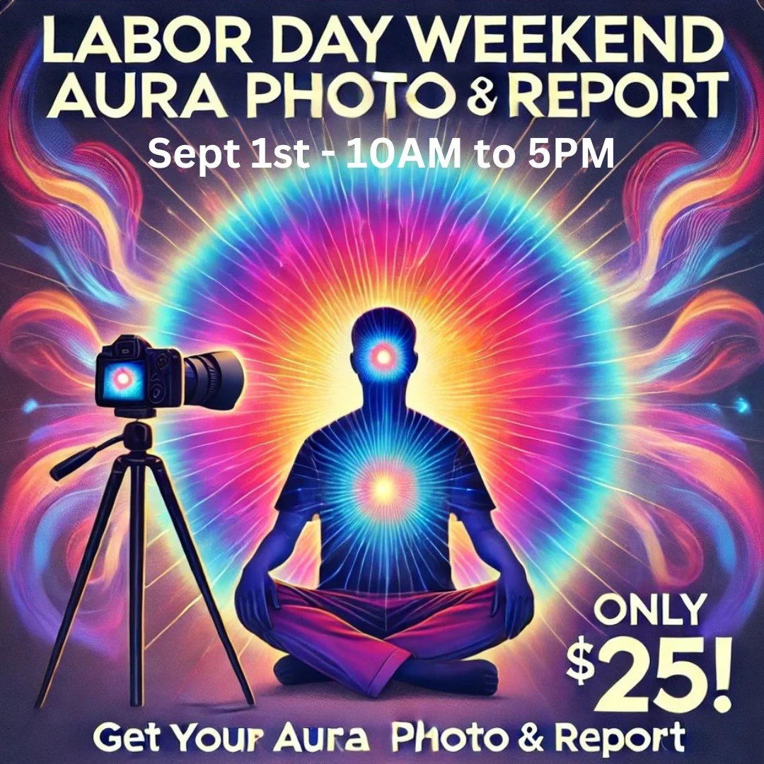 Join us for our Labor Day Weekend Aura Photo Event! Capture the vibrant colors of your aura with a stunning photo and detailed report for just $25. Want even more insight? Upgrade to include an intuitive reading for a special price of $45. Don't miss this opportunity to learn more about your energy and well-being.