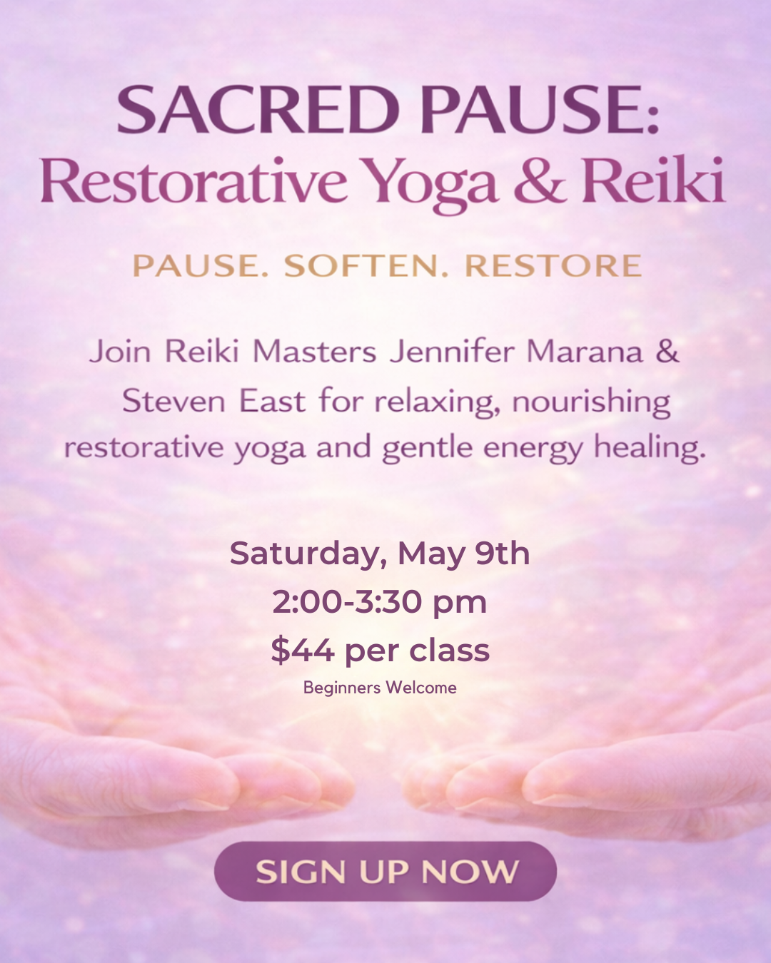 Give yourself the gift of deep rest and renewal. This 90-minute Restorative Yoga and Reiki class with Jennifer Maraña and Steven East offers a gentle and supportive space to slow down, soften tension, and reconnect with your body and breath.