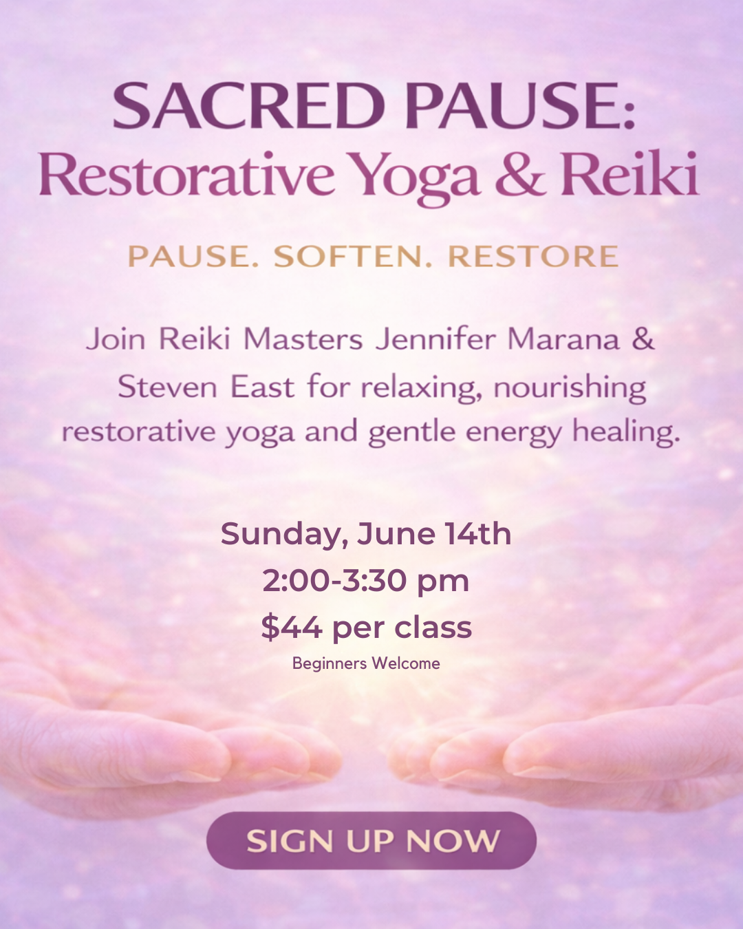 Together, restorative yoga and Reiki create an opportunity to pause in the middle of your day, release accumulated stress, and restore a sense of inner calm and clarity.